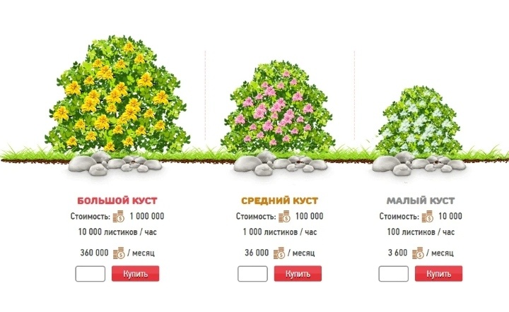 Самый доступный куст стоит 10 000 монет. Важно: монеты – игровая валюта. В итоге, 100 монет приравниваются к 1 рублю (настоящему). Таким образом, игрок может купить куст, самый дешёвый, за 100 рублей. Купленный куст будет приносить по 100 чайных листьев в час. Следует заметить, что цена 20 листьев приравнивается к 1 монете. Это ровно 0.01 рубля, или 1 копейка. Наконец, куст будет приносить по 1 копейке в час. За месяц роста куст принесёт 3 600 монет (36 рублей). Всего кустов три вида. Самый дорогой куст стоит 10 000 рублей.