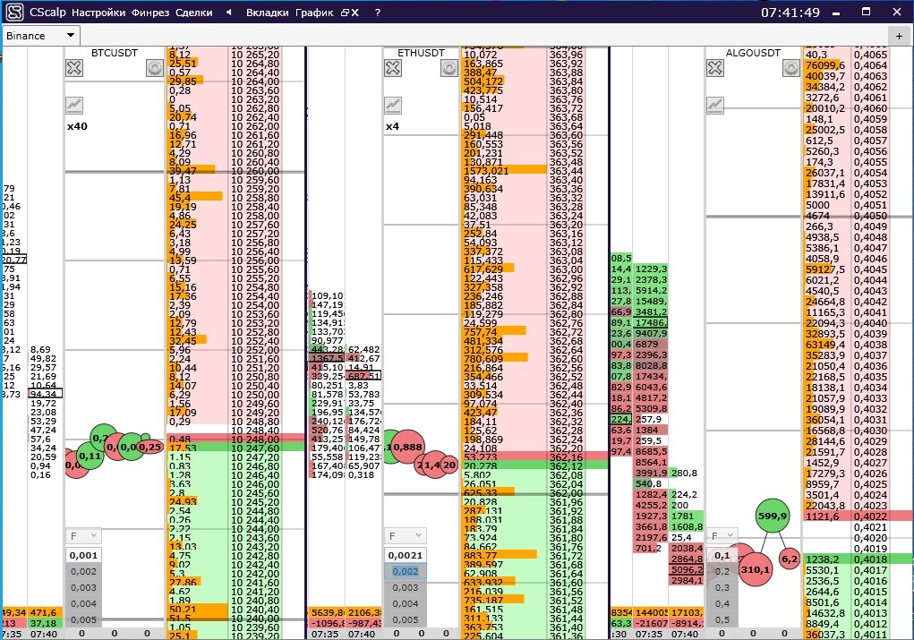 CScalp работает с криптовалютными биржами Binance, Bybit, FTX, OKX, EXMO, Bitfinex, BitMEX, dYdX (DEX-биржа), а также с Московской биржей (MOEX). Подключиться к MOEX можно через QUIK, Transaq Connector и SMARTcom.