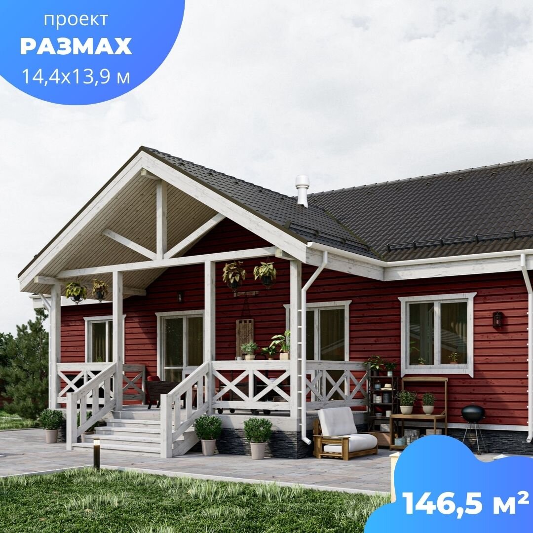 Почти 147 квадратов — есть, где размахнуться! "Одноэтажный домик встречает своих жильцов и гостей с благоговением и уютной террасой. Проект "Размах" выполнен по канадской каркасной технологии, а значит будет сохранять тепло все 12 месяцев в году. При должном уходе срок эксплуатации такого жилья не ограничивается временными рамками. Любите свой дом, и он ответит вам тем же! Вид со всех 4-х сторон для полной картины проекта. Один этаж, где всё есть! А именно 3 просторные спальни, внушительных размеров кухня-столовая, санузел, тех.помещение, коридор и милая уютная терраса. Всё в этом домике на своём месте. "Размах" — это тот проект, который получил своё название в честь своих площадей, удивляющих масштабами. Если вы переедите в такой дом из квартиры, то необъяснимое чувство простора очень долго не покинет вашу семью! Проект "Размах" можно построить примерно за 4,1 млн руб. Смотрите подробную информацию о проекте. Подписывайтесь на наш дзен-канал! Есть вопросы по строительству? Звонит