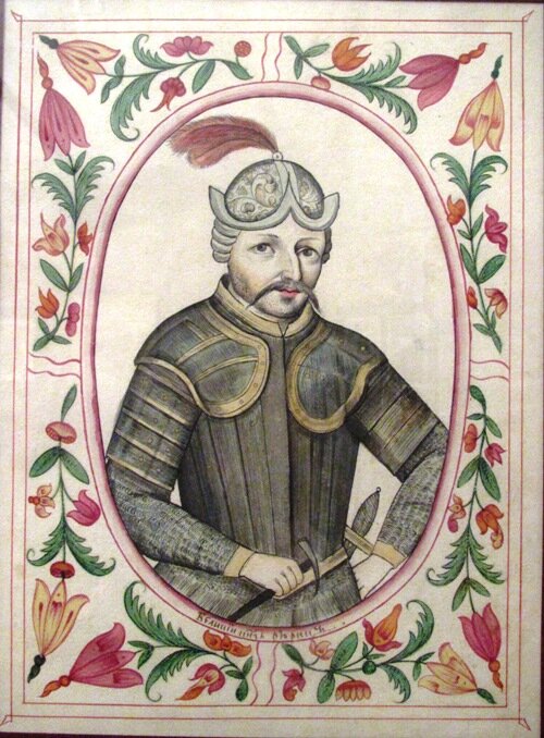 В общем лицо, оружие, инструмент, кольчуга, усы и прочее говорит нам, что это средневековый западноевропейский военачальник. Хотя кто его знает, может так тогда и русские воины выглядели. Точнее их начальники. Но портрет точно нарисован в средние века. Колчуга на нем точь в точь, как и на портрете Петра Первого, нарисованном Готфридом Кнеллером во время пребывания Петра в Англии.