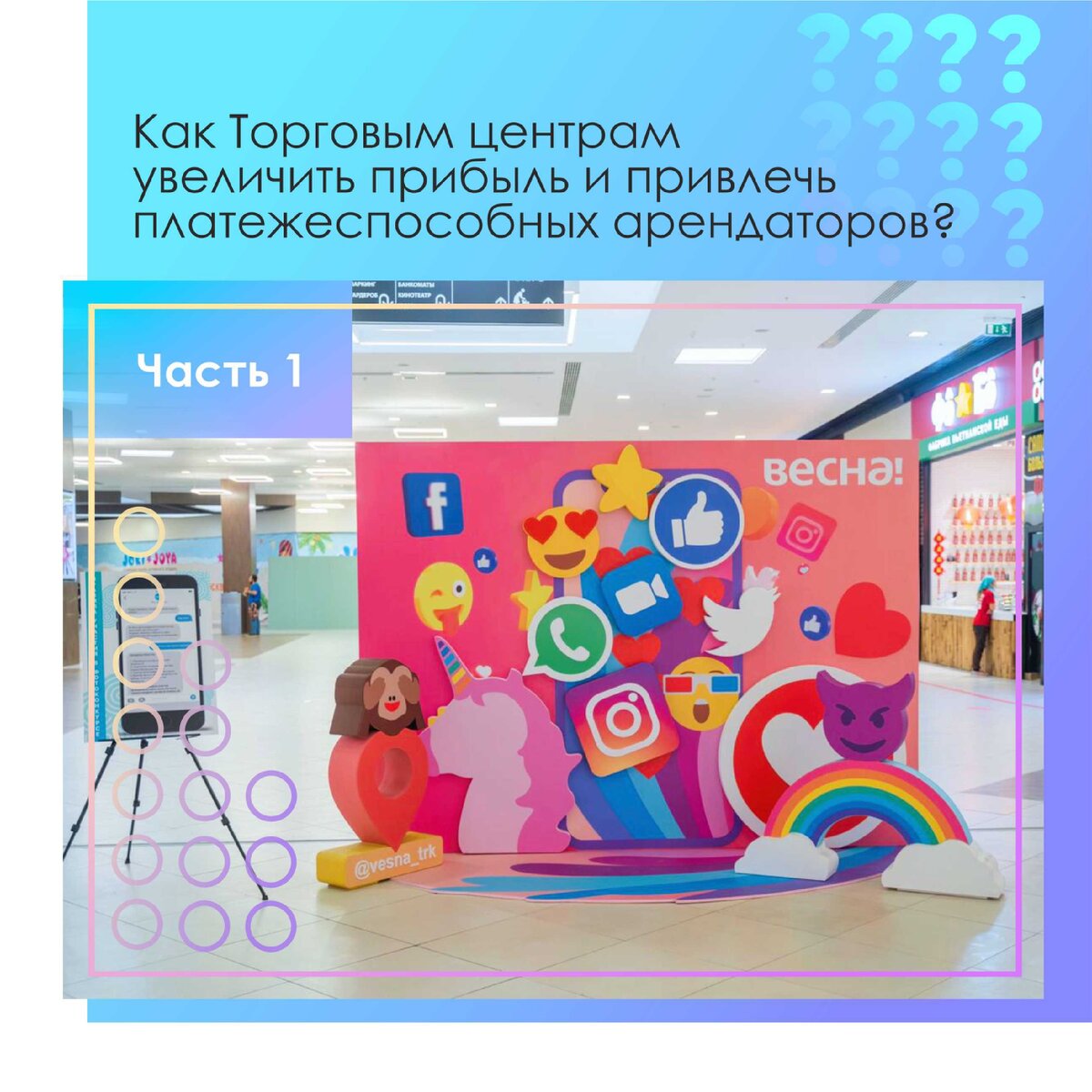 *Фотозона с хештегом или названием торгового центра это хороший способ мотивировать посетителей делать фото и постить их в сеть, тем самым рекламируя ваш ТЦ.