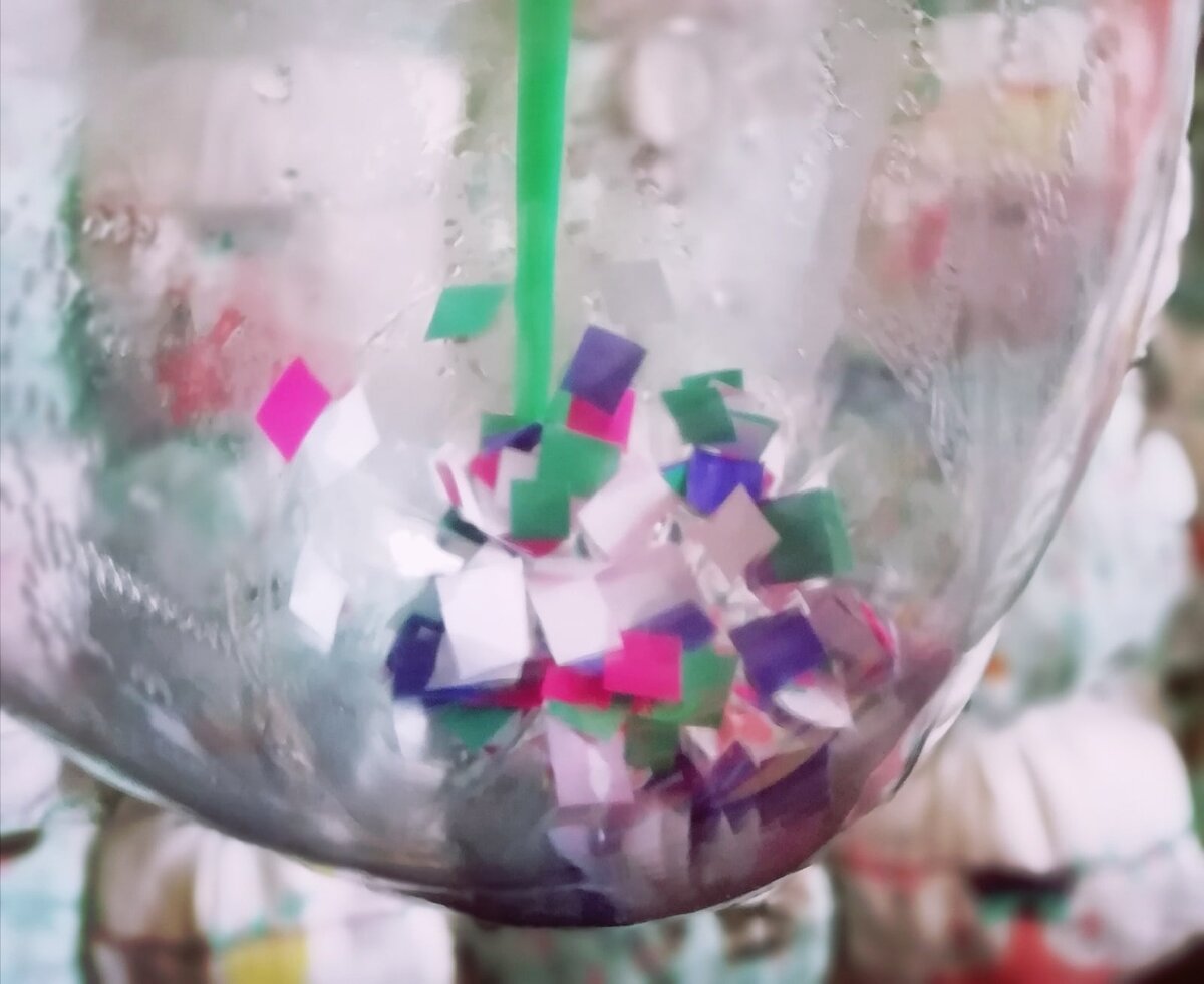 - Понадобится пластиковая бутылка, небольшая и прозрачная. Мама насыпает внутрь легкие предметы, например, звездочки, вырезанные из бумаги, или просто квадратики, что угодно. В горлышко вставляется трубочка, в которую ребенок начинает дуть. А легкие бумажки разлетаются по всей бутылке, оседают на стенах, а потом снова падают на дно.