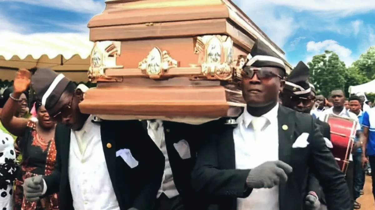 Вместо оплакивания, там нанимают профессионалов, которые будут танцевать с гробом и именно из-за этого отличия от обычных похорон мем обрел такую популярность. 26 февраля, в тик-токе, пользователь с нимком @lawyer_ggmu — выложил лыжника, который едет под трек Tony Igy — Astronomia и неудачно прыгает с трамплина. Под конец прыжка, добавил танцующих с гробом африканцев, как результат прыжка. Такое сочетание музыки и танца африканцев, вызвало комичный эффект и привело к тому, что этот ролик получил огромную популярность и впоследствии стал мемом.