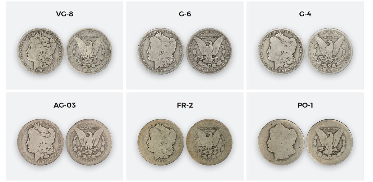 G (good) - англ. "good", нем. "gut erhalten" Относится к монетам, на которых остались различимы только основные контуры рисунков. Надпись и дата выпуска трудно различимы. Дефектные монеты, относящиеся к металлическому лому, имеют более серьезные повреждения: намеренно нанесенные очень глубокие царапины, насечки, выбоины; надпилы, соскобы; отверстия, следы припоя и травления; деформация диска; отслоения металла; сильную степень истертости, при которой невозможно прочесть надпись и дату монеты.
