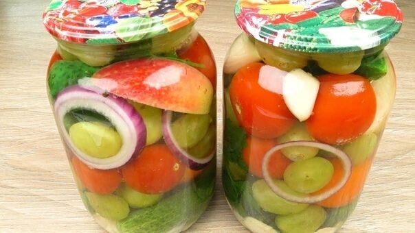 Рецепт на 1-литр.банку: маленькие огурчики (или порезать),помидорки(наколоть,чтобы не лопнули),болгарский перец(разрезать на 4-6 частей),2-3 дольки чеснока,виноград,яблоко(разрезать на 4-8 ч.),1 красная луковица(на 4-6ч.). На дно банки уложить петрушку,укроп,1 лавр.лист,2 горошинки черн.перца,2-3 вишневых листочка,1 ч.ложку измельченного хрена.Сложить овощи,фрукты и залить маринадом:2 литра воды,5 ст.л.сахара,3 ст.л.соли,1,5-2 ч.л.лимонной кислоты,3 бутона гвоздики.Маринад покипятить 3 мин.и разлить,его хватает примерно на 4 1-литр.банки.Банки прикрыть крышками и стерилизовать 20-30 минут,закатать.