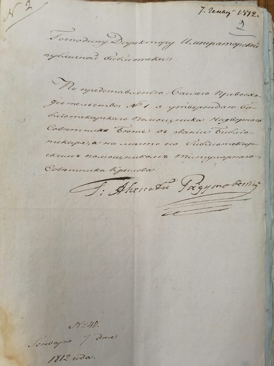 2 января 1812 года недавно назначенный директором Императорской публичной библиотеки Алексей Оленин обратился к министру народного просвещения графу Алексею Разумовскому с просьбой – определить в помощники библиотекаря одного титулярного советника.