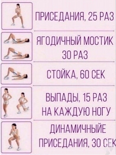 Ягодичные мышцы тела - это 3 парные мышцы: большая, средняя и малая ягодичная. Большая ягодичная мышцы бедра - самая крупная мышцы всего организма. Она начинается у тазовой кости, крепится к задней поверхности бедренной кости чуть ниже тазобедренного сустава. Функция этой мышцы - разгибать бедро с небольшим вращением наружу. При фиксации бедра она отклоняет таз назад. Средняя ягодичная мышцы начинается на ягодичной поверхности подвздошной кости, переходит в короткое широкое сухожилие и крепится к большому вертелу бедра. Малая ягодичная мышца расположена под средней ягодичной. Функция всех этих мышц - отведение бедра. Особенности тренировки Если у вас маленький таз, и вам нужно просто подтянуть ягодицы и сделать их упругими, выбирайте тренировки с большими весами. Тренируйтесь по 2 раза в неделю, между каждой тренировкой должно проходить не менее 2 суток. Делайте 4-5 подходов по 5-8 повторений. Если будет преследовать боль - не пугайтесь, просто примите ванну или сделайте кардио. Если
