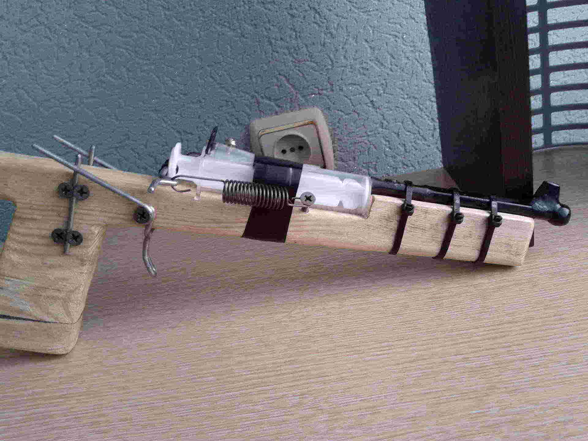 Еще одного Шептуна собрал. Немного увеличил разгон поршня, поставил кожаную манжету из ремня. Внутри стальной трубки ,трубка из под шарика .Шарик удерживается неодимовым магнитом из под наушников. Дульно зарядное заряжание, шарик сам проваливается и крепко удерживается магнитом. Вес пистоля не более 40 грамм. Спуск регулируется выдвижением боковых гвоздиков. Спуск комфортный ,короче чем на иж 53.Стреляет очень бесшумно ,почти нет отдачи. Точность отличная ,я так с иж 53 не стрелял. Мишень с 8 метров 7 шариков укладываются в рублевую монету и даже меньше ,стрелял с двух рук.