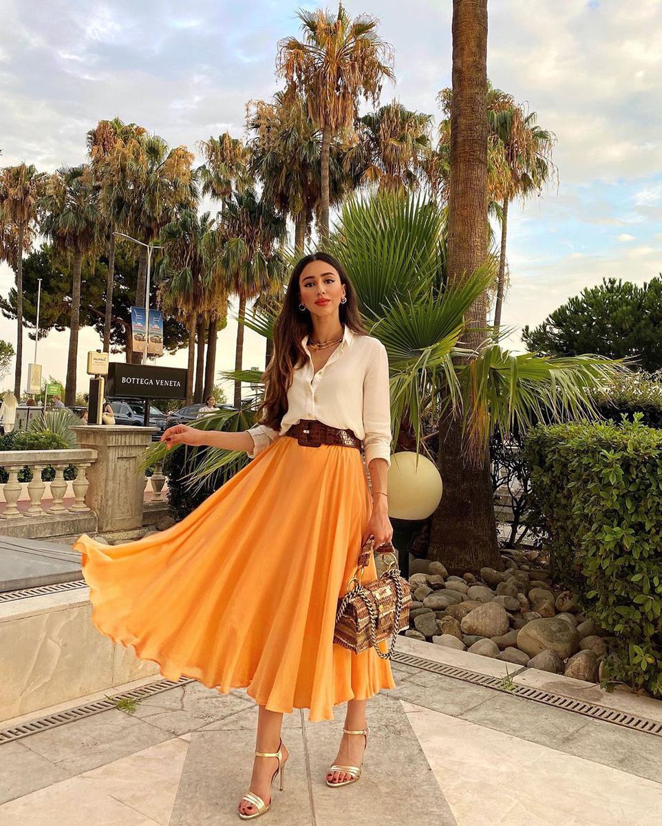 В новом сезоне горчичный цвет вошел в состав модной осенней палитры. Тандем юбки-миди, блузы и босоножек на шпильке выглядит очень женственно и утонченно. Такому образу под силу привлечь к себе внимание и интерес любого мужчины. Теплый бежевый оттенок блузы особенно эффектно смотрится на загорелой коже, а широкий коричневый пояс ловко подчёркнет достоинства фигуры.