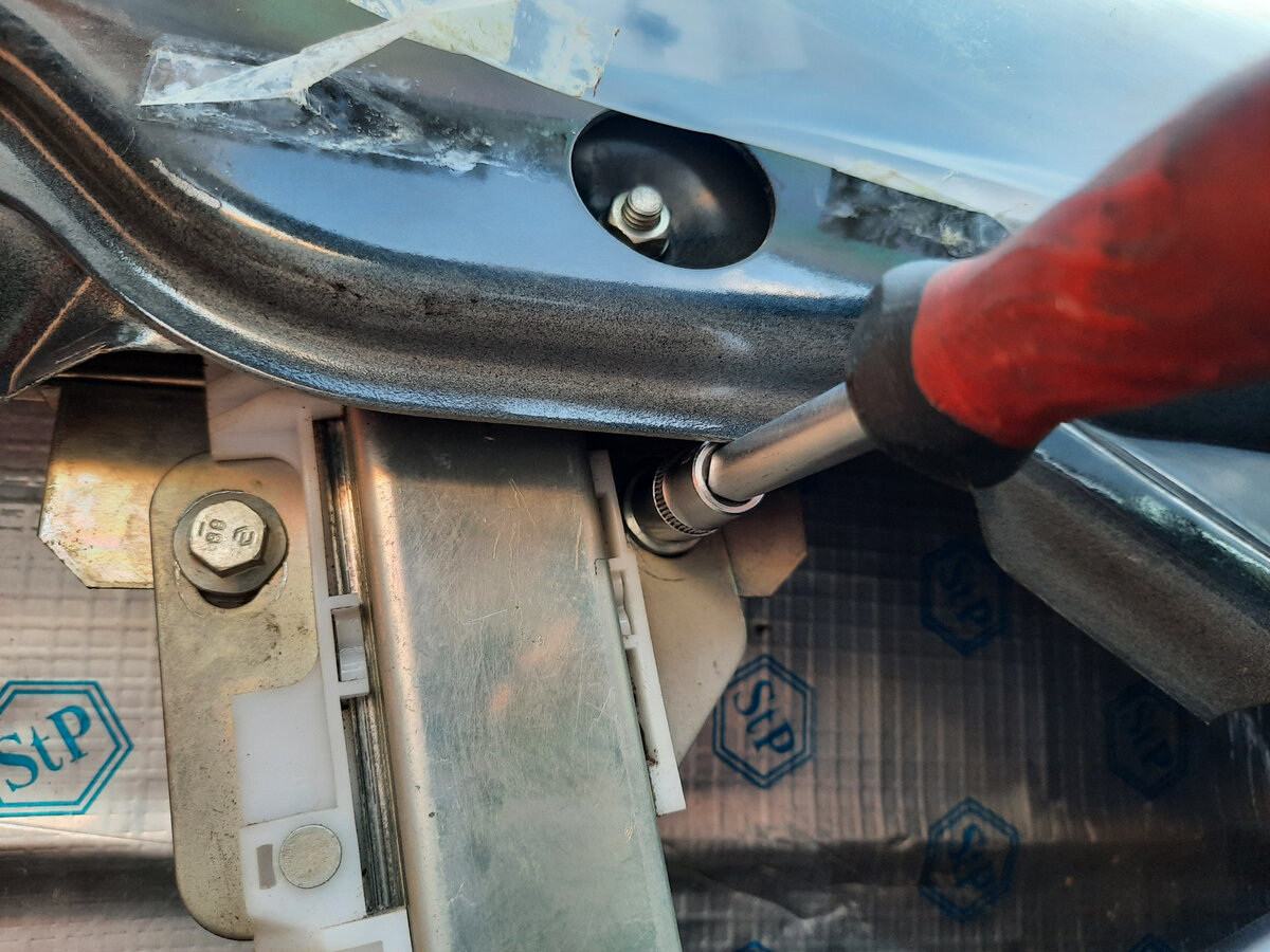 После чего нужно отпустить два болта каретки стеклоподъемника фиксирующих стекло ключом на 10 мм. Я это делаю ключом трещоткой с торцевой головкой и удлинителем.