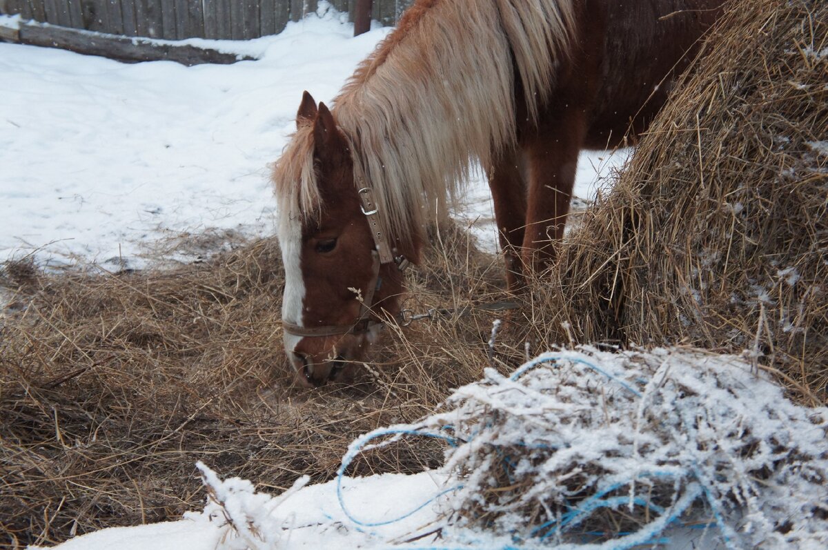 Этот кадр был сделан в тихий декабрьский день в гостях у подруги. Неторопливо падал снег, вокруг была уютная тишина. Лошадь во дворе неторопливо ела сено.