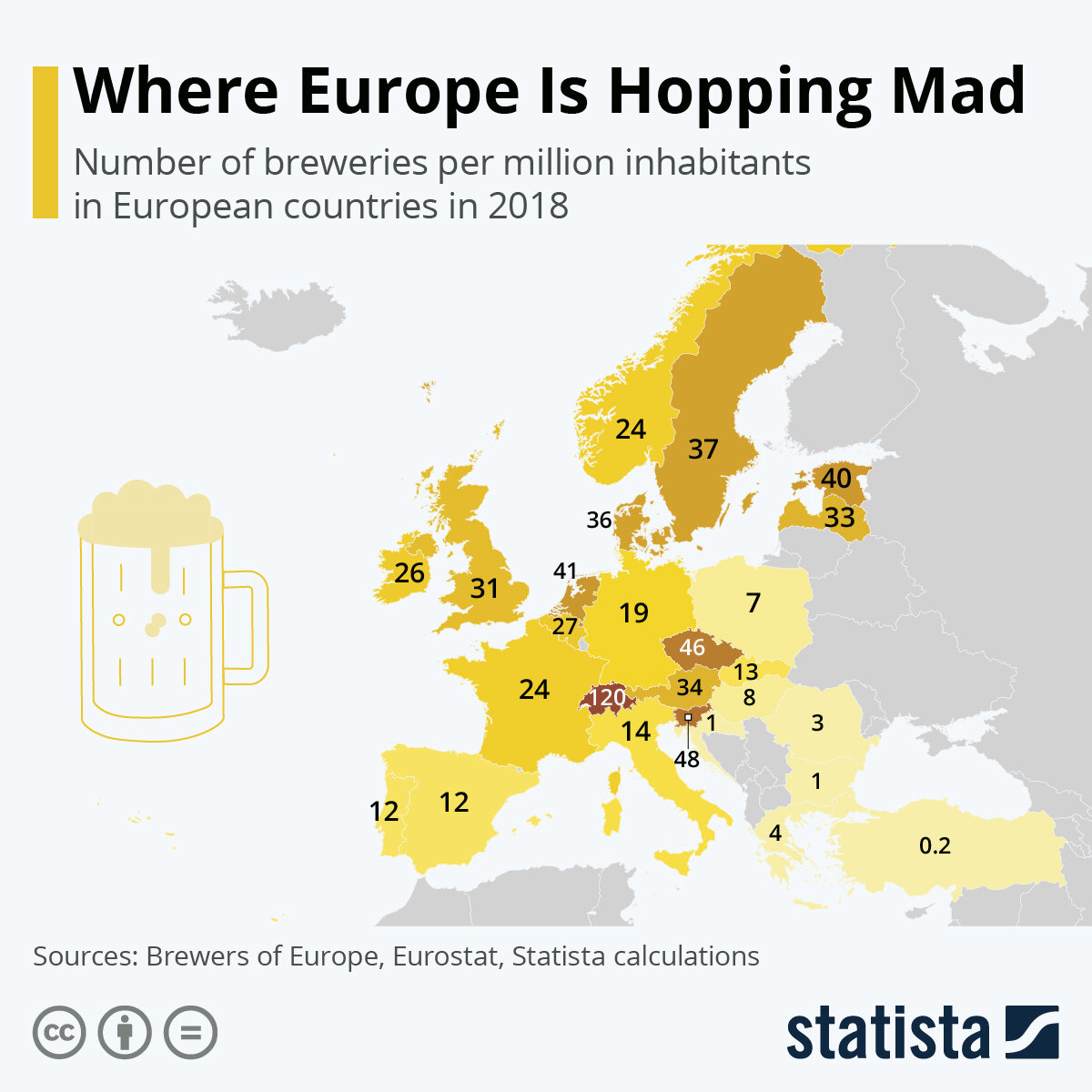 120 пивоварен на миллион жителей (при населении около 8.5 миллионов человек). Впечатляющая цифра, особенно если сравнить с идущей второй Словенией (48 пивоварен на миллион жителей). Третье место, кстати, наконец выглядит достаточно ожидаемо - Чехия и 46 пивоварен на миллион проживающих в стране. В отстающих, ожидаемо, мусульманская Турция.