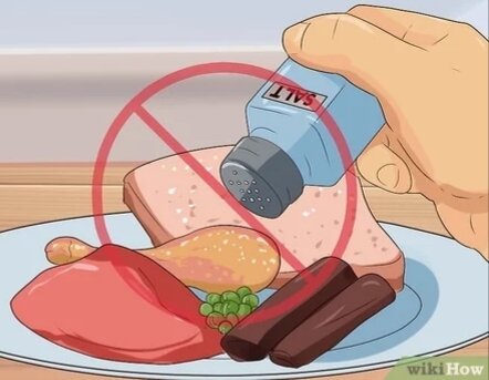 1- Не добавляйте в продукты лишнюю соль.Кладите в еду не более щепотки соли во время приготовления блюда и не досаливайте пищу, когда едите. Соль, безусловно, нужна организму, однако она должна поступать в организм в небольших количествах, так что вы и так получаете слишком много соли, если едите готовые блюда и добавляете небольшое количество соли, когда готовите сами. [1]