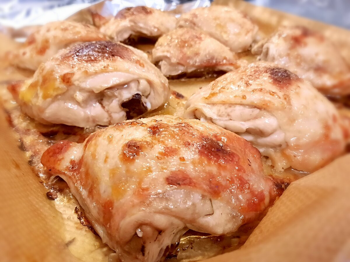 По истечение времени достаем бедра из маринада, просушиваем полотенцем, смазываем любимым соусом (у меня сметана с горчицей или барбекю), ставим в хорошо разогретую духовку примерно на 45 минут. Не пережарьте, проверяйте зубочисткой до прозрачного сока.
