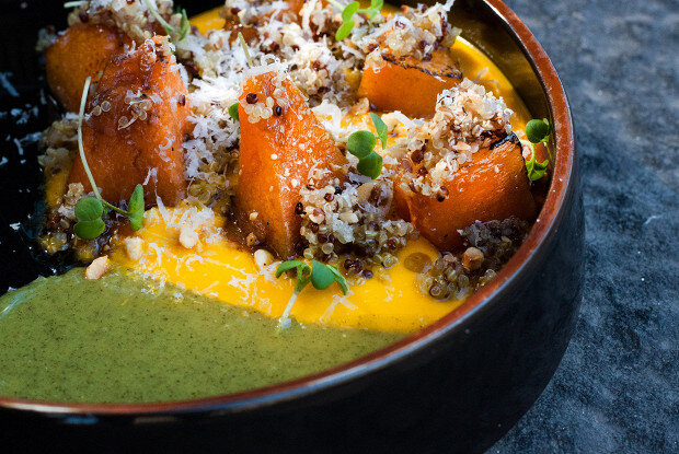 5. Распределяем тыквенный соус по тарелке, выкладываем заправленную тыкву, затем киноа. Добавляем тыквенные семечки, обжаренный фундук и натертый пармезан.