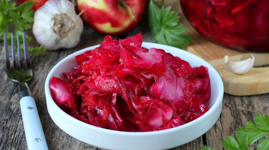 Необходимые продукты: Маринад: - Вода – 2 л. - Соль – 1,5-2 столовые ложки. - Сахар – 2 чайные ложки. - Уксус – около 0,5 стакана (добавляйте по вкусу!). - Подсолнечное масло – 0,5 стакана. Основные продукты: - Капуста – 1 кочан крупный. - Морковь – 2 шт. - Свекла – 2 шт. - Чеснок – 10 зубчиков. - Лавровый лист, перец душистый, перец горький. Способ приготовления: Капусту нарезаем сначала дольками, а потом дольки измельчаем, чтобы, в итоге, получились небольшие прямоугольнички на один укус. Морковь, свеклу и чеснок очищаем и нарезаем произвольными небольшими кусочками. Затем укладываем овощи слоями в емкость, я использую кастрюлю на 5 л. Между слоями раскидываем поровну чеснок, несколько лавровых листочков, перец. Затем доводим до кипения воду, в которую добавлены соль и сахар. Горячим рассолом заливам содержимое кастрюли, и только после этого вливаем уксус и подсолнечное масло. Пробуйте на вкус, если кислинки, на ваш взгляд, маловато, можете добавить еще уксуса. Через 3 часа капустку