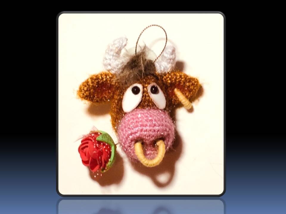 Глаза- из фетра или фома вырезать овалы, приклеить к ним полубусины .Приклеить глаза к голове. Вставит в нос кольцо, при желании можно сделать кольцо и в ухо. При желании можно сделать чёлку быку из кусочка меха.