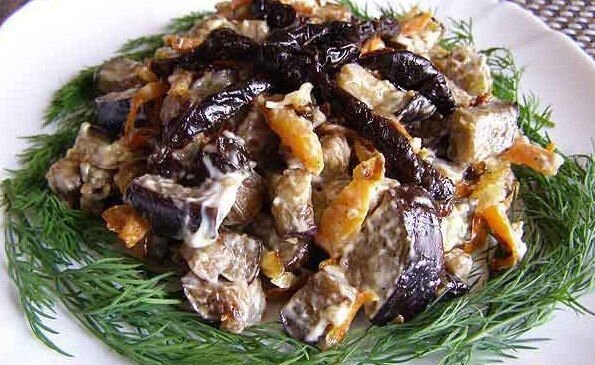 САЛАТ ИЗ БАКЛАЖАНОВ С ЧЕРНОСЛИВОМ ИНГРЕДИЕНТЫ: Баклажан - 1 шт. Морковь - 2-3 шт. Лук - 1 шт. Чернослив - 50 г. Чеснок - 2 зубчика Растительное масло для жарк Майонез по вкусу Соль, молотый черный перец - по вкусу. РЕЦЕПТ ПРИГОТОВЛЕНИЯ: Баклажаны нарезать кубиками. Посолить и оставить, чтобы отошла горечь. Потом промыть под проточной водой. Луковицу очистить и нарезать. Морковь очистить и нарезать соломкой. На небольшом количестве растительного масла пассировать лук. Добавить морковь и обжарить до мягкости. Переложить поджаренный лук и морковь в салатник. Обжарить кубики баклажанов. Добавить к луку и моркови. Чернослив нарезать кусочками. Чеснок выдавить через чеснокодавку. Добавить к остальным ингредиентам. Посолить, поперчить и заправить майонезом. Хорошенько перемешать.
