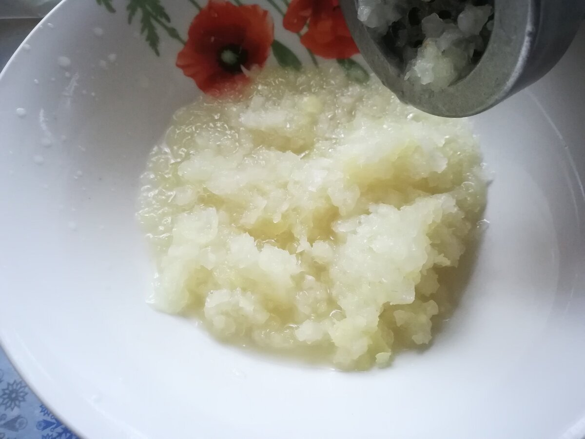 Итак, мы всё измельчили, добавляем на тёртый на средней тёрке чеснок и яйцо, незабываем посолить.
