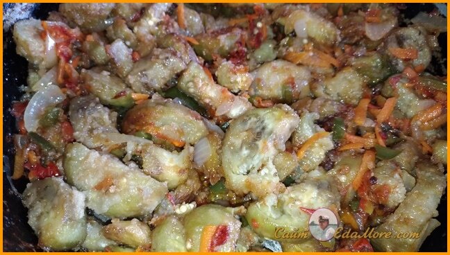 7. Жарить баклажаны до румяной корочки. Как подрумянятся, добавьте к ним пассерованные овощи, посыпать солью и грибной приправой на свой вкус. Перемешать.