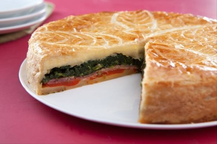 Выкладывайте тесто в блюдо (кастрюлю) и ковыряйте вилкой, затем выровняйте его с половиной грюйера. Затем распределите ломтики ветчины, шпинат, сладкий перец, а затем яичницу. Накройте все оставшимся грюйером и вторым тестом. Почистите верхнюю часть пирога позолотой и украсьте кончиком ножа. Сделайте дымоход в центре, зате