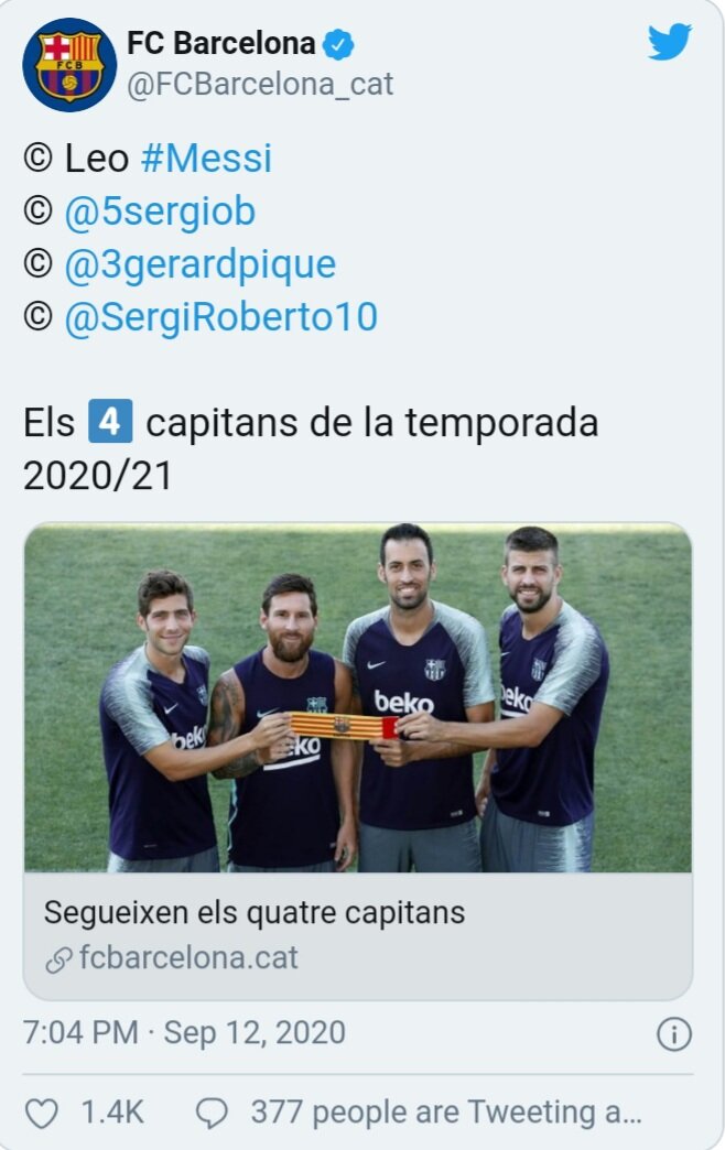 Капитанами сине-гранатовых останутся Лионель Месси, Серджи Буксетс, Жерар Пике и Серджи Роберто – в указанном порядке очередности.