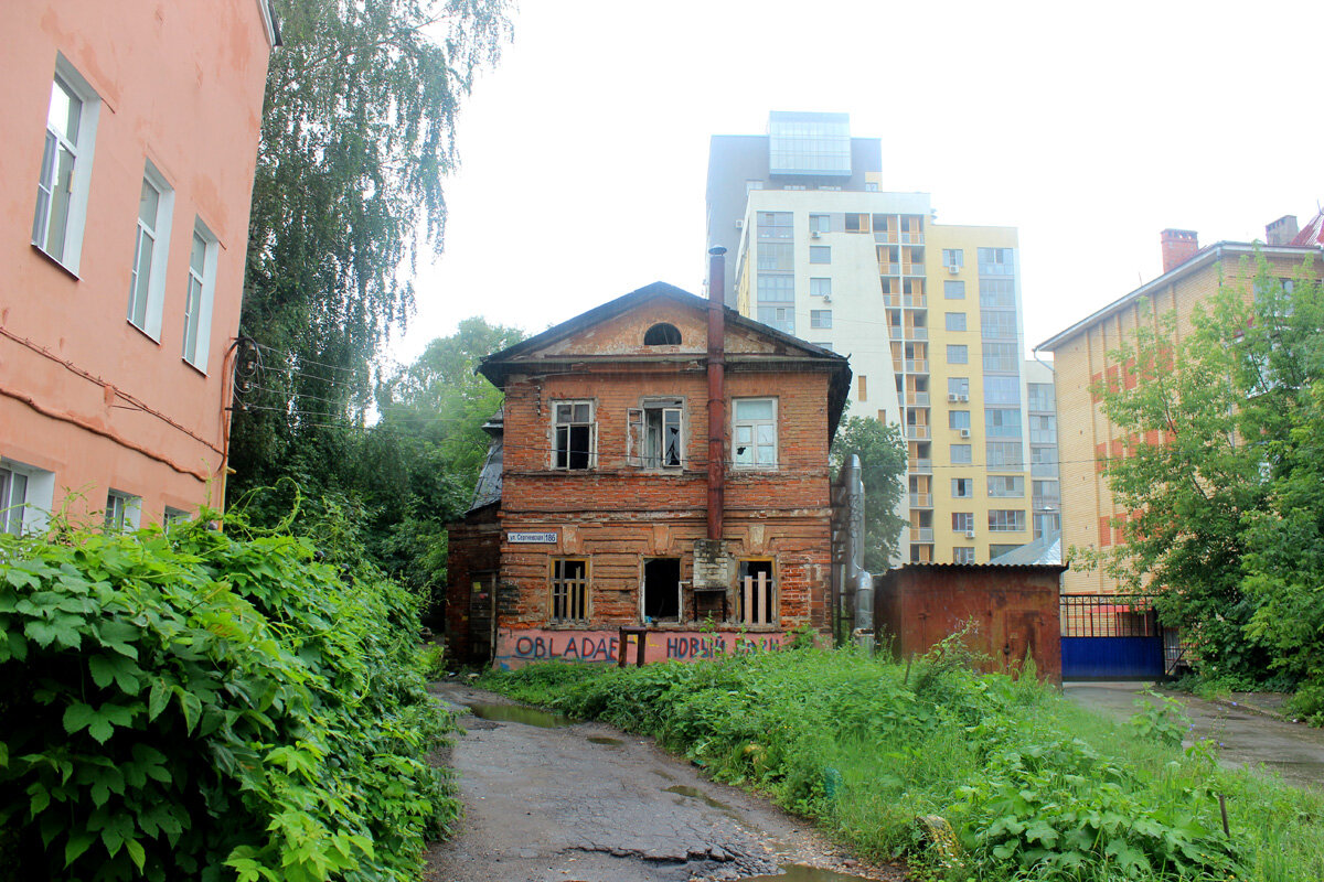 Кроме Москвы и Санкт-Петербурга, я был во многих областных центрах России: Смоленске, Калуге, Туле, Твери, Новгороде, Пскове, Владимире, Ярославле, Костроме, Казани, Йошкар-Оле. Такого количества ободранных, полуразрушенных или заброшенных зданий в центре города не видел больше нигде. Вот яркий пример: одна половина дома уже заколочена, другая еще пока держится. Строение явно XIX века.