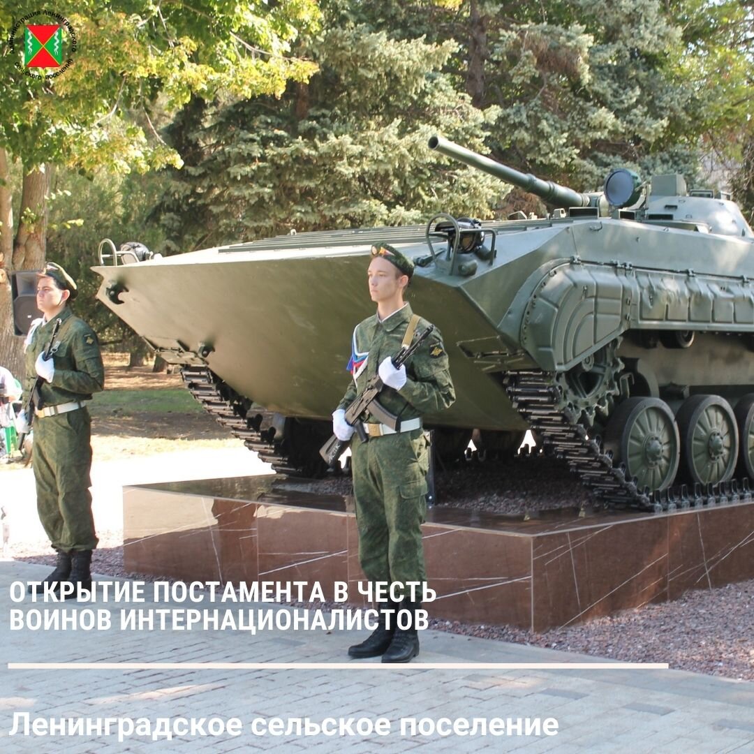 12 сентября глава Ленинградского сельского поселения И.С. Скоробогаченко вместе с депутатом Государственной думы Д.Ю. Пирог и исполняющим обязанности главы Ленинградского района Ю.Ю. Шулико принял участие в церемонии открытия постамента БМП-1. Памятник посвящен ветеранам локальных войн и конфликтов с честью исполнивших свой воинский долг. Расположен новый постамент на Октябрьской площади ст.Ленинградской. Установкой боевой машины пехоты занималась рабочая бригада АО «ЛЕНИНГРАДСКАГРОПРОМЭНЕРГО», рабочие выполнили облицовку постамента керамогранитными плитами, установили подсветку и памятную плиту с надписью – «Ветеранам локальных войн и конфликтов с честью исполнивших свой воинский долг. Родина выбрала нас». Вес БМП-1 около 7 тонн. В машине нет двигателя, это облегченный вариант без боевого снаряжения.