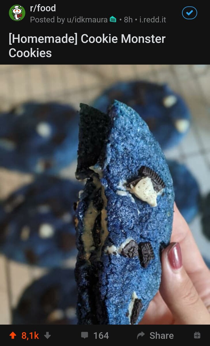 Недавно на Reddit поделились фотографией необычного синего печенья. Как мы можем понять из названия треда, эти печенья напрямую связаны с персонажем из "Улицы Сезам" Коржиком (Cookie Monster). Этот персонаж всем известен своим аппетитом и сильной любовью к печенью. Что касается треда и конкретно печенья, многие люди в комментариях к треду просили поделиться рецептом этого прекрасного печенья: -МНЕ НУЖЕН РЕЦЕПТ -ДАЙ НАМ ЭТОТ ЧЁРТОВ РЕЦЕПТ!!! -Это именно то, о чем я хотел попросить. Они выглядят ооочень хорошо. -Можем ли мы узнать рецепт?😍 Но никаким рецептом никто так и не поделился Именно поэтому я нашёл для вас примерный рецепт такого печенья! Ингредиенты: (примерно на 25 штук) •2 и 1/4 стакана универсальной муки •2 и 1/2 столовые ложки какао-порошка •1 и 1/2 чайной ложки кукурузного крахмала •3/4 чайной ложки пищевой соды •1/2 ч. л. соли •120г сливочного масла •6 ст. л. растительного масла •стакан сахара •1 яйцо •1 яичный желток •1 и 1/2 чайной ложки уксуса •1 и 1/2 чайной ло
