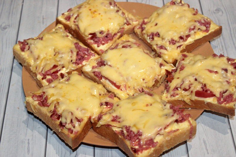 Привет!Сегодня будет необычная статья на тему Бутерброды.Бутербро́д (от нем. Butterbrot — хлеб с маслом) — закуска, представляющая собой ломтик хлеба или булки, на который положены дополнительные пищевые продукты[1].Бутерброды бывают совершенно разных типов по способу приготовления;простые или сложные,открытые,закрытые,слоистые,закусочные.Сегодня я хочу поделится рецептом вкусного и самое главное быстрого бутерброда.У каждого дома есть эти ингредиенты.Итак начнем! Для горячего бутерброда вам понадобится;1)Помидора 2)Колбаса 3)Майонез 4)Кетчуп 5)Сыр 6)Нарезанный хлеб (батон) Способ приготовления: 1)Помидоры и колбасу нарезать мелко кубиком 2)Майонез с кетчупом смешать и добавить нарезанную колбасу и помидоры 3)На нарезанный хлеб положить получившуюся массу 4)Натереть на мелкой тёрке сыр и посыпать на бутерброд 5)Поставить в микроволновку или в духовку на 3-5 минут Бутерброд гоотов!Приятного аппетита!