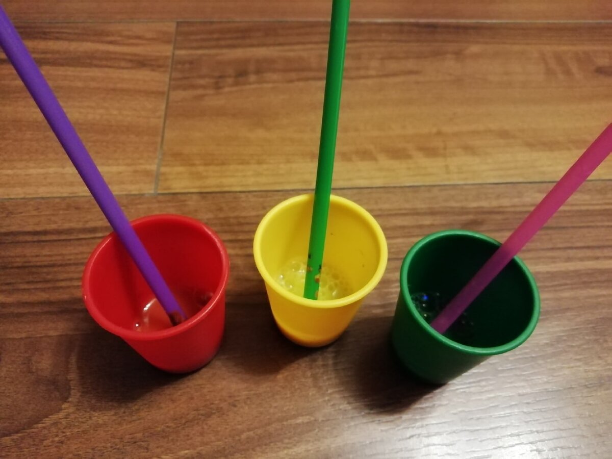 Мыльная жидкость разливается по стаканчикам, добавляется немного краски (кисточкой или той же трубочкой).