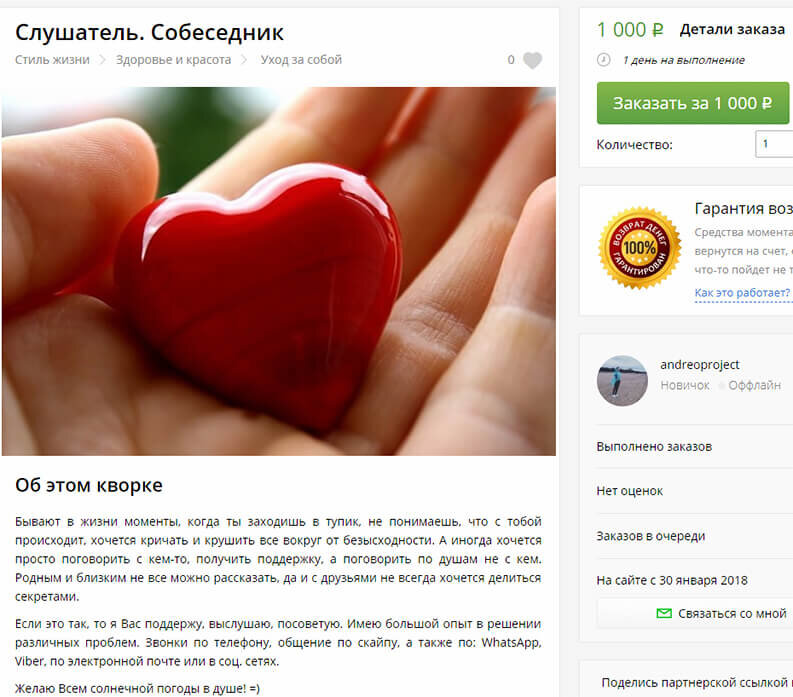 - Поговорить по телефону. На свете много одиноких людей, да и случаются ситуации, когда нужно поговорить, а не с кем. На бирже по фрилансу Kwork есть подобные объявления, где за 1000 рублей можно выслушать человека.