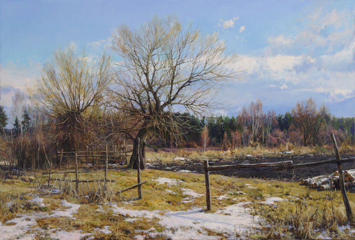 И чутко просыпается природа! Иван Есаулков Живопись – это особенный вид искусства, который отчетливо и красочно передает видение автором конкретного пейзажа, натуры. Умение передать красками красоту окружающего мира и вложить в неё свои чувства, переживания свойственно талантливым мастерам кисти. Пейзаж «Весеннее утро» художника Владимира Давыденко отличается необыкновенной красотой и реалистичностью. Картина раскрывает тонкие нюансы весенней природы. Перед нами предстает пашня, ветхая ограда, сосновый бор вдали. Свежо…Запах мокрой прошлогодней травы…Яркое солнце покрывает готовые к пробуждению ветви деревьев нежным цветом и норовит истребить остатки снега. Мастер точно передает ощущение высокого прозрачного неба. Особое внимание уделено изображению плывущих по небу облаков. Их меняющийся силуэт подчеркивает широту простора земли. Художник настольк