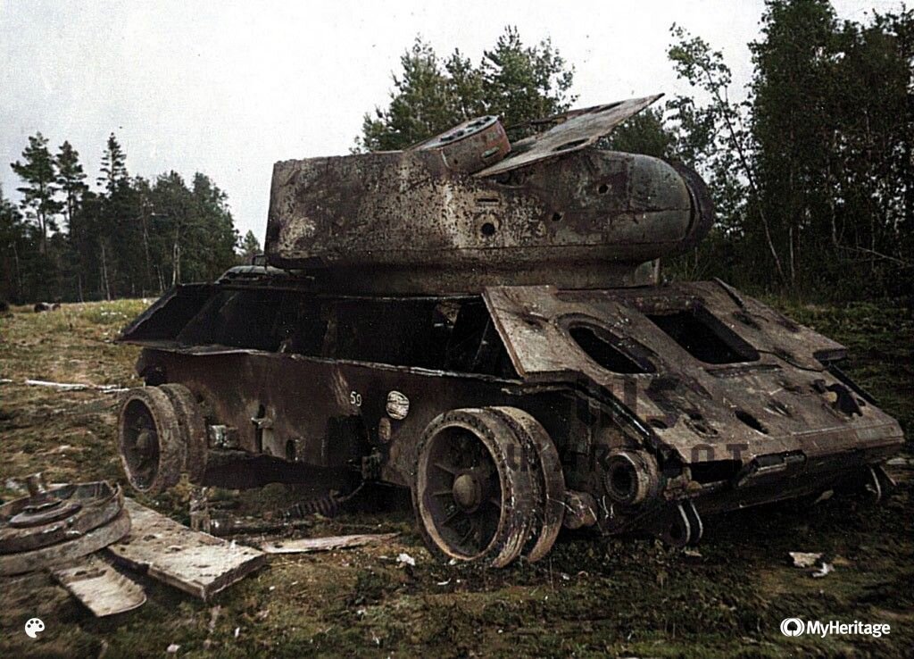 "Защитная полумера" Cредний танк Т-34-85М после обстрела немецкими 75/88-мм бронебойными и ОФ-снарядами