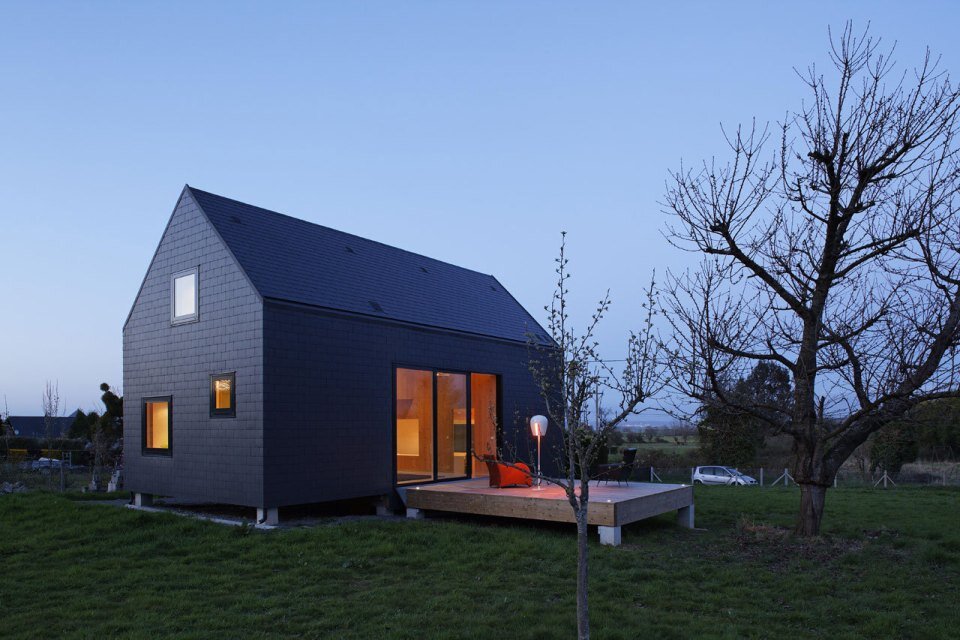 Всем привет! Здравствуйте, дорогие читатели! Я пишу о домах с душой ) Но это не только дома со старинными интерьерами и мебелью, но и вполне себе современные дома, в которых чувствуется душа хозяина. Я люблю концептуальную, современную архитектуру. Хотя бы просто потому, что построить дом четко, красиво, без "ляпов" бывает очень сложно! Особенно, если используются контрастные, открытые цвета - все огрехи, как на ладони. Планировка дома в конце статьи, как и схема конструктива. Этот дом G расположен в сельской местности недалеко от побережья Нормандии и был спроектирован компанией Lode Architecture для молодой семьи. Черное покрытие (алюминиевая плитка) и резко очерченные края придают этому маленькому дому поразительный вид, но он кажется домашним в своей сельской обстановке. Интересная технология используется с применением клееных конструкций. Сейчас эта технология набирает обороты прежде всего за границей, особенно в Европе (это связано с экономией древесины). Некоторые панели были о