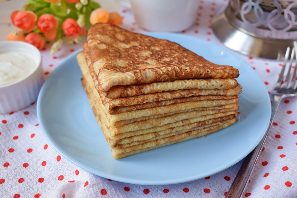 Готовые блинчики можно дополнить сметаной, сгущенным молоком или джемом.