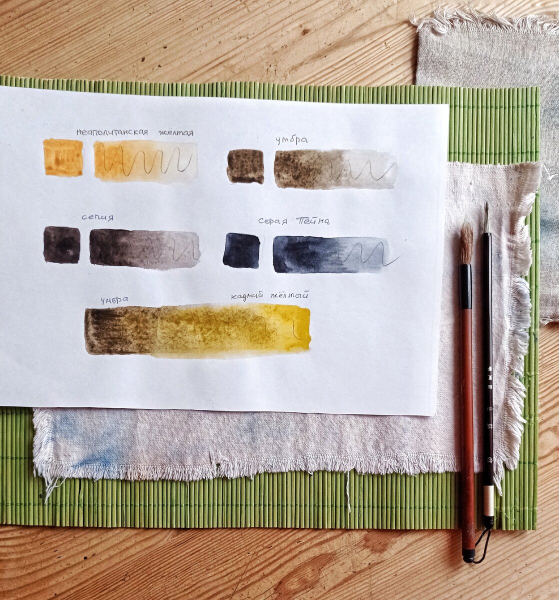 Приятный оттенок умбры дают три пигмента: охра светлая (P.Y. 43), сиена (P.Br. 7) и ламповая копоть (P.Bk. 7). Её тоже можно использовать для гризайли и портретов. Кроме того, на примере умбры я хочу показать один приём использования многопигментных красок, который я ещё ни у кого не встречала. Всем известно, что большое количество пигментов чаще всего даёт некрасивую смесь. Поэтому сложные краски рискованно ещё с чем-то смешивать. А что если усилить в фабричной смеси один компонент? К сепии добавить охры красной или к умбре — охры светлой?