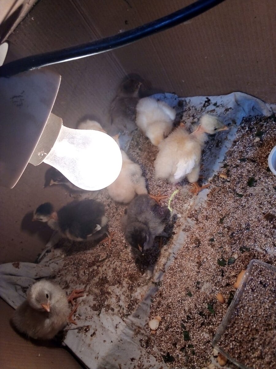 Цыплятам оборудовали чистый " детский садик " , с лампой и много воздуха и места , до месяца они бегают там , кормушки - поилки размещаются свободно . Растут как на дрожжах , и практически без падежа . В картонных коробках все было печальнее . Соорудили сие из подручных досок , площадью примерно 1.5 метра . Стелим чистый плотный картон , ровно , чтобы малыши нигде не застревали и не калечились . А сверху закрываем старыми оконными рамами , удобно , чтобы никто не навредил малюткам . Садик поставили в сарае , много места не занимает . Так им очень комфортно . На участке обнаружили дикий чеснок зеленый , мелко рубим и подкармливаем цыплят , это для них сроду десерта .