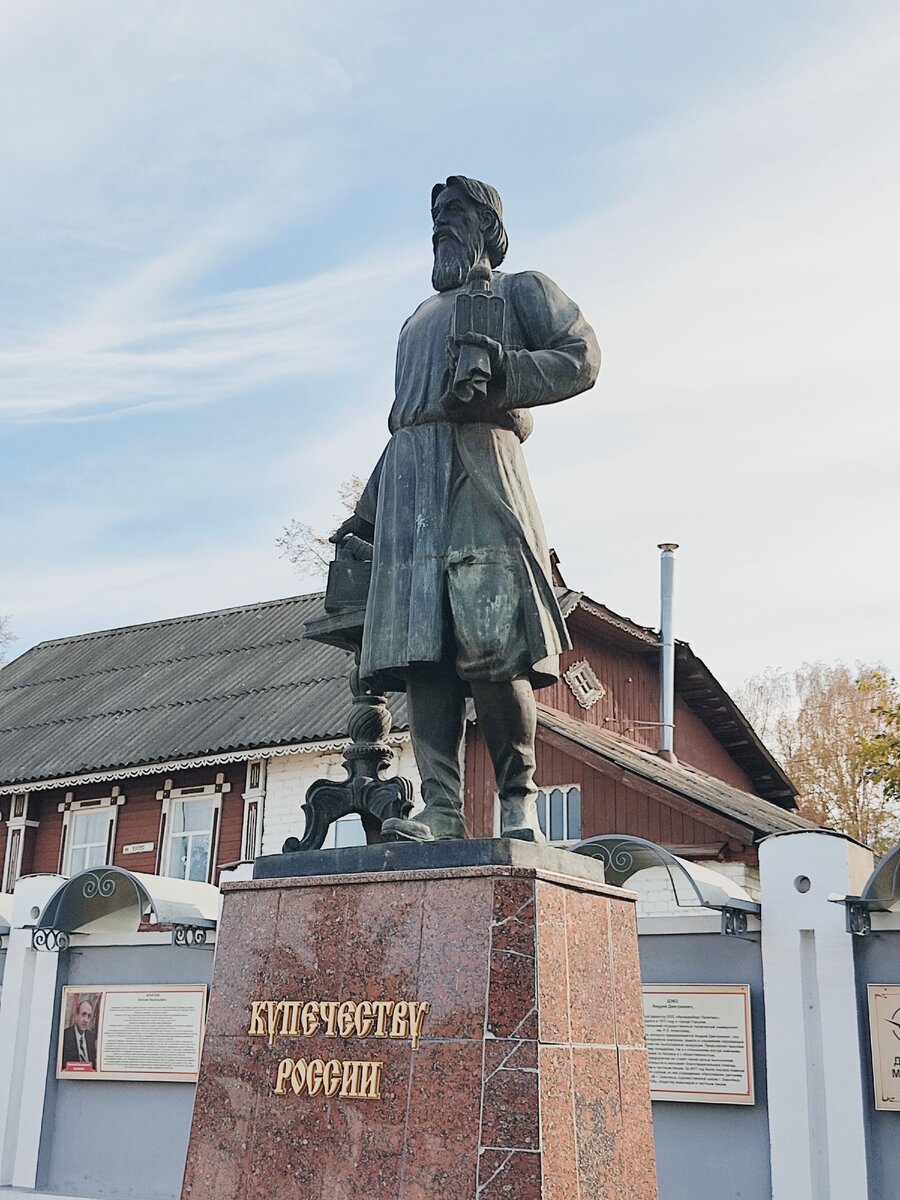 Памятник купцу стоит в сквере рядом с народным домом - здание строилось на средства земства и городского купечества для бесплатной библиотеки-читальни в 1906-1907 гг., он же всесловный клуб. Архитектурный стиль модерн.