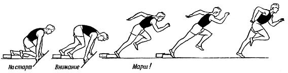 По команде «Внимание!» он несколько подается вперед и переносит тяжесть тела на руки, вследствие чего мышцы ног в значительной мере освобождаются от статического напряжения, что улучшает условия для их дальнейшей работы. Для упора ног применяются стартовые колодки или станки, а при отсутствии их в грунте роются ямки. Гл. преимущество колодок — обеспечение твердости опоры и более высокого расположения стоп спринтера, что способствует убыстрению выхода со старта. По стартовому сигналу (выстрелу или команде «Марш!») бегун с большой силой отталкивается обеими ногами и энергично взмахивает руками.