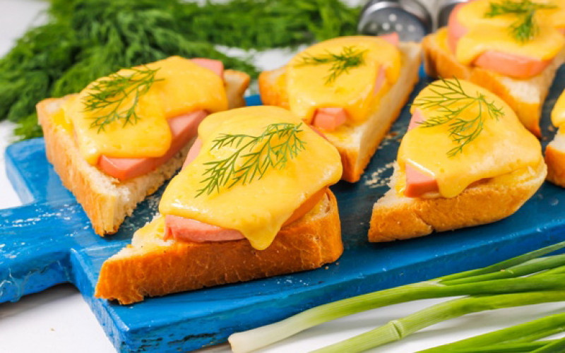 колбасу, соленый огурец. Полить майонезом и посыпать тертым сыром. Запечь в духовке до расплавления сыра. К столу подать в горячем виде.