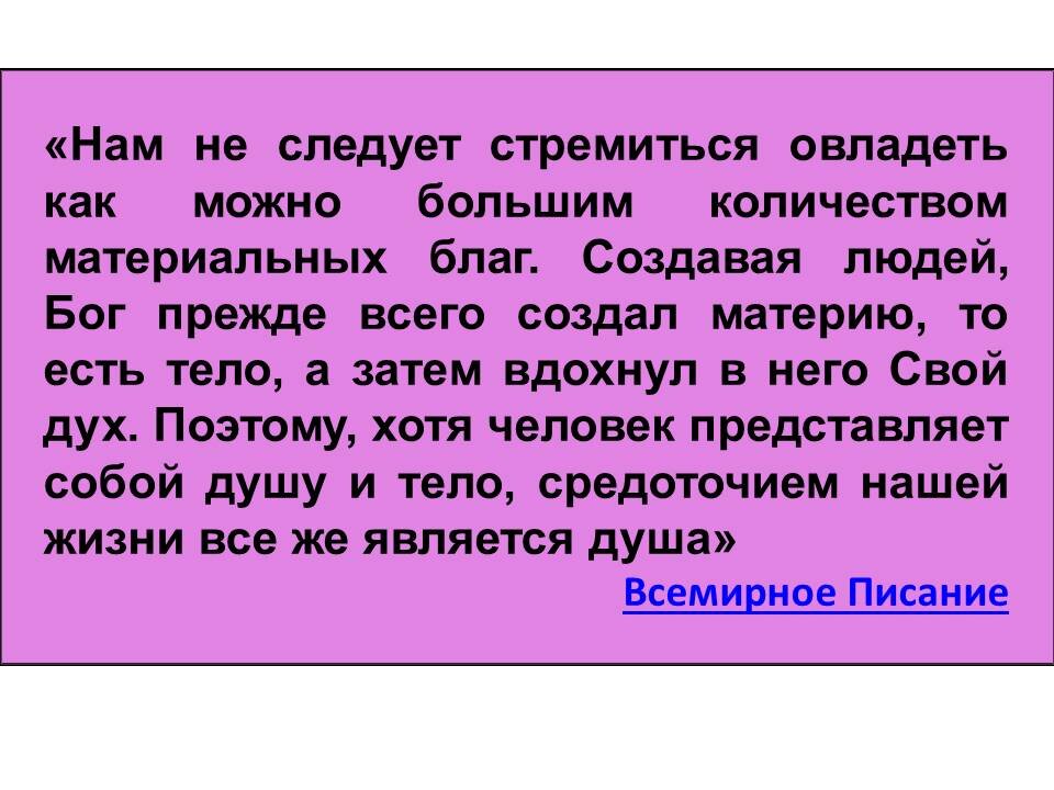 Нам не следует стремиться овладеть как можно большим количеством материальных благ. Создавая людей, Бог прежде всего создал материю, то есть тело, а затем вдохнул в него Свой дух. Поэтому, хотя человек представляет собой душу и тело, средоточием нашей жизни все же является душа.