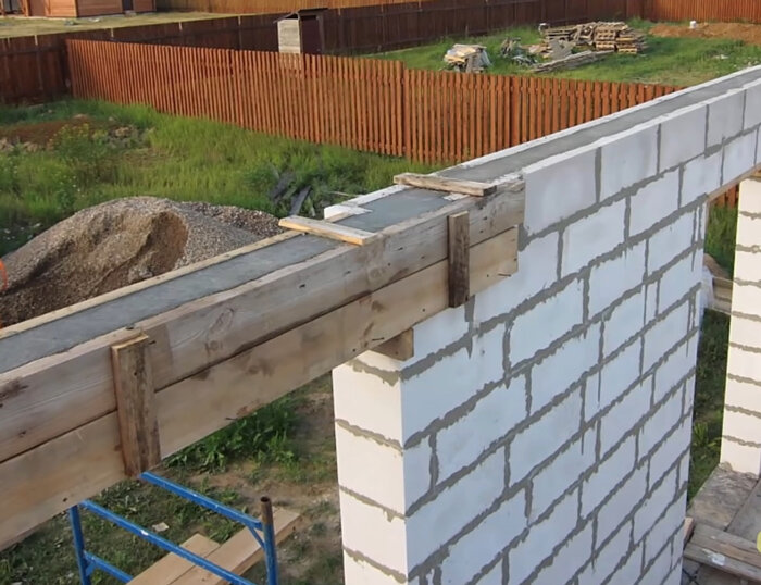 Если позволяет ширина стены, то с другой стороны блоков устанавливаем также доборные блоки, если нет – устанавливаем по краю стены опалубку из сборных щитов либо досок.