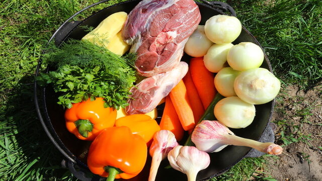 Курдюк нарезать на средние куски. Мясо баранины разрезать на большие куски. Лук нарезать полукольцами Болгарский перец на кольца Помидор кольцами Морковь кольцами Из курдюка вытопить жир на несильном огне. Затем шкварки удалить из казана На сильном огне закладывать мясо для обжаривания После мяса закладывается лук. Смешивается с мясом и жариться до того состояния, пока лук не начнет отдавать свой сок, станет мягким После лука добавляем морковь, перемешиваем. Солим, перчим и добавляем зиру. После этого перемешать Далее идет помидор.Так же солим, перчим и кидаем зиру. Перемешиваем все вместе. Оставляем до того момента, пока помидор не отдаст свои соки блюду. Около 10 мин перемешивая тушим. Вливаем в казан около 1,5 литра чистой воды.