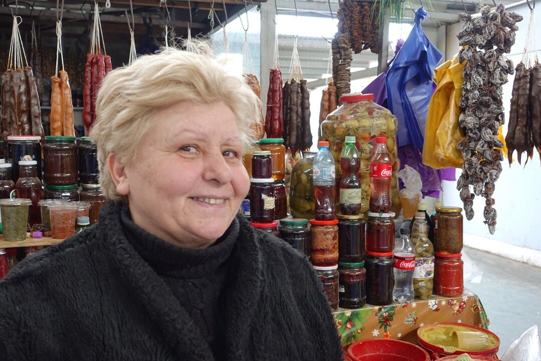 Тина - кардиолог, 35 лет проработала врачом. Потом лечебницу распустили, и безработная Тина долго думала, как выжить. Выжила благодаря маминой науке готовить! А то, что она делает - это необыкновенно вкусно! Ткемали, сецебели - ВАХ! Соленья, чача с вишней, чурчхела. Пока нет покупателей - сидит и нанизывает орешки на ниточку. Дома будет поздно вечером окунать в татару - густое варево из виноградного сока и муки.