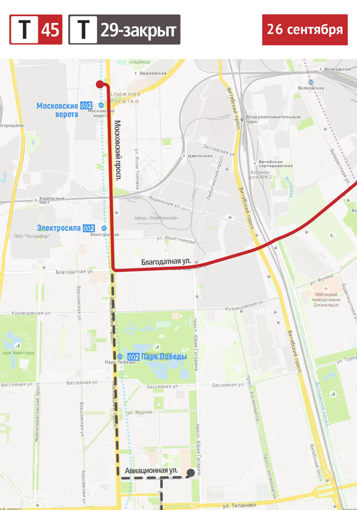 Трамвай № 45 направлен от Благодатной ул. по Московскому пр. до конечной остановки “Трамвайный парк № 1”.
