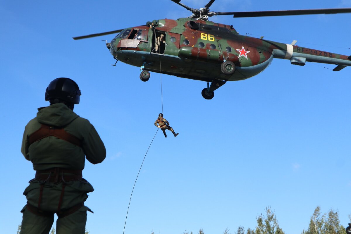 Сотрудники СОБР «Гранит» и ОМОН (на транспорте) Главного управления Росгвардии по г. Санкт-Петербургу и Ленинградской области провели занятия по отработке действий при беспарашютном десантировании с вертолета «Ми-8».