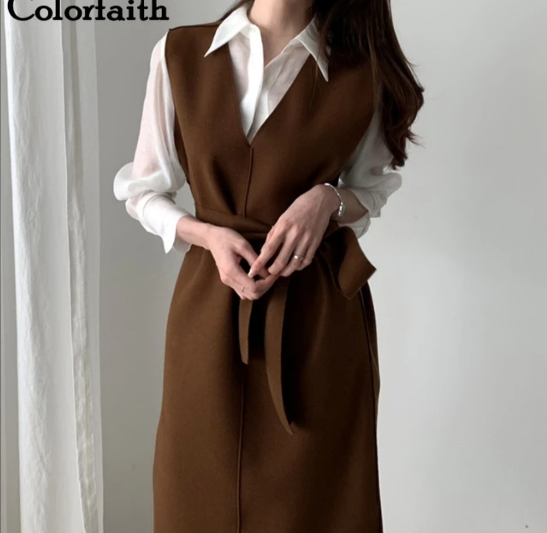 Плотное трикотажное платье надевается сверху тоненькой рубашки или водолазочки.