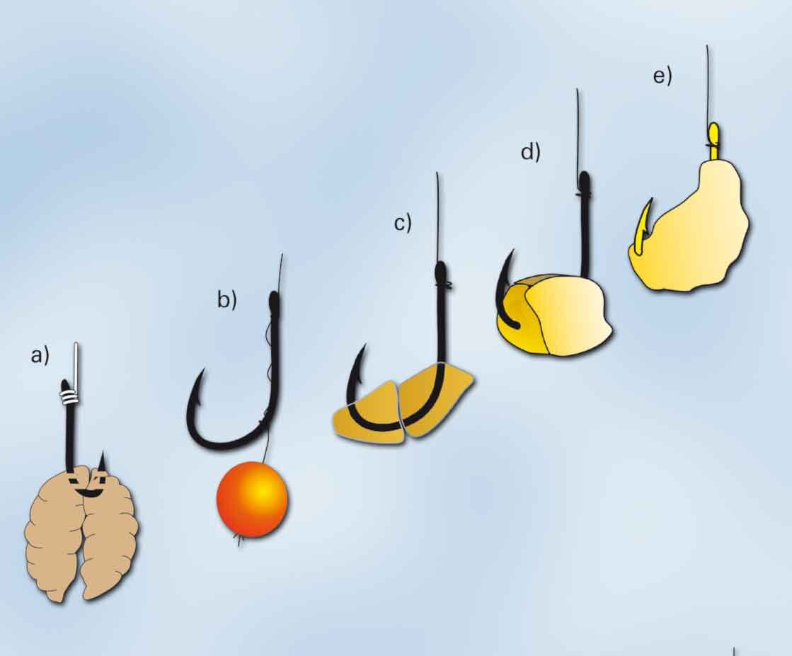 e) жмыха f)червя Красные черви - очень популярная приманка, но они не всегда хорошо прикрепляются. Первое: лезвие всегда должно быть сверху, второе: червяк должен быть «свежим» и подвижным, чем он больше, тем привлекательнее он выглядит для рыбы.