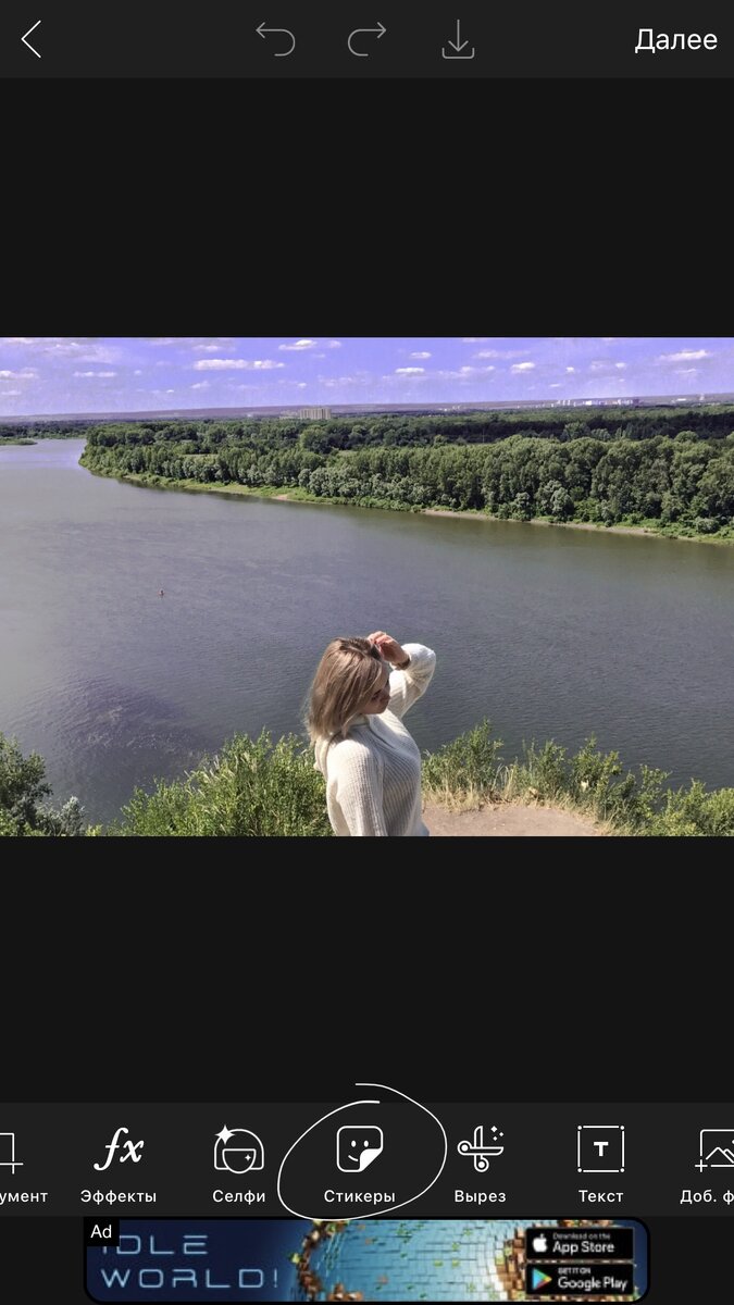 открываем фото в приложении PicsArt, и нажимаем на вкладку "Стикеры":